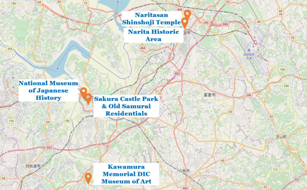 Narita & Sakura Area Naritasan Shinshoji Templehttps://www.naritasan.or.jp/english/ Narita Historic Areahttp://www.nrtk.jp/translate/index.php?lang=en&path=/top.html National Museum of Japanese Historyhttps://www.rekihaku.ac.jp/english/ Sakura Castle Park & Old Samurai Residentials観光施設紹介 Kawamura Memorial DIC Museum of Arthttp://kawamura-museum.dic.co.jp/en/ 2019年8月13日 moreandmore